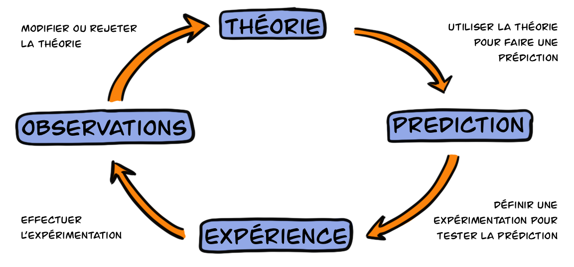 Pour résumer la méthode scientifique en quelques ligne, on peut dire que celle-ci commence par la formulation d’une théorie. Grâce à cette théorie, nous allons imaginer une prédiction en imaginant ce qui devrait se passer dans des conditions définies si la théorie est vraie. Ensuite, nous imaginerons une expérience à réaliser dans le but de tester cette prédiction. Il nous suffira alors d’observer le résultat de l’expérience afin d’accepter de modifier ou de rejeter la théorie.
